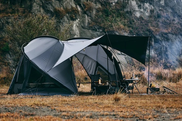 軽いのに広い。大きいのに簡単。 軽量素材と設営しやすい設計で、機能過多に頼らない洗練された使い勝手を実現。 軽やかさ追求した2ルームシェルターです。 ■圧倒的な軽量設計(本体約8.4kg) 家族がゆったり過ごせる大型2ルームテントながら、本体重量約8.4kg(ペグ除く)という驚きの軽量化を実現。車からの持ち運びや、テント設営の身体的な負担を大幅に軽減し、設営のストレスから解放します。 ■高性能な40Dシルナイロン生地 軽量かつ高強度な40Dシルナイロンを採用。優れた耐風性に加え、しなやかで高級感のある美しい質感が特徴です。サイトの雰囲気を高める美しい張り姿を生み出します。 ■スピーディーな設営 使うポールは全て同じ長さの4本だけ。迷うことなく、差し込み口も中央付近に集中させた設計で、設営時の移動や負担を最小限に。軽い生地も相まって、立ち上げもスムーズです。 ■左右対称デザイン テント全体が左右対称なので、向きを気にせず設営しやすい構造。 オプションのインナーテントは左右どちらにも取り付け可能で、2つ装着すれば最大8人で利用できる宿泊テントとしても使用できます。 ■跳ね上げ可能な2か所の出入り口 両サイドに大きなパネルドアを備え、跳ね上げ式で開放感を高めたり、キッチンやリビングスペースを拡張しやすい設計。 ■圧迫感のない天井高(最大210cm) テント内の最大天井高は210cmを確保。背の高い方でもかがむことなく快適に移動でき、圧迫感のないストレスフリーな空間を実現。 ■ゆとりのワイド設計(横幅350cm) 横幅は広々の350cm。テーブルやチェア、荷物も余裕で置けるリビングを実現。家族やグループでも圧迫感がなく、自由なレイアウトでゆったりと過ごせます。 ■スカートに代わるボトム設計 各ペグダウンループ/フレーム差し込み口の仕様を工夫することで、一般的なシェルターよりも最低地上高を低くする設計を施しました。地面との隙間を最低限に抑え、ミニマルでありながら、寒い季節でも活躍します。 ■タープの代わりとして使える 前後のドアを全開にすれば、オープンタープのような圧倒的な開放感と広い日陰を生み出します。デイキャンプではリビングとして、急な雨風の際はすぐに閉じられる安心感も魅力です。 ■収納ケース1つにおさまる 収納サイズ約70x27x30cm。大型の2ルームテントながら、ポールやインナーテントもまとめて、1つの収納ケースに収まります。 ■区画サイトにおさまる 車を入れても8×8のサイトで余裕のあるレイアウトができます。