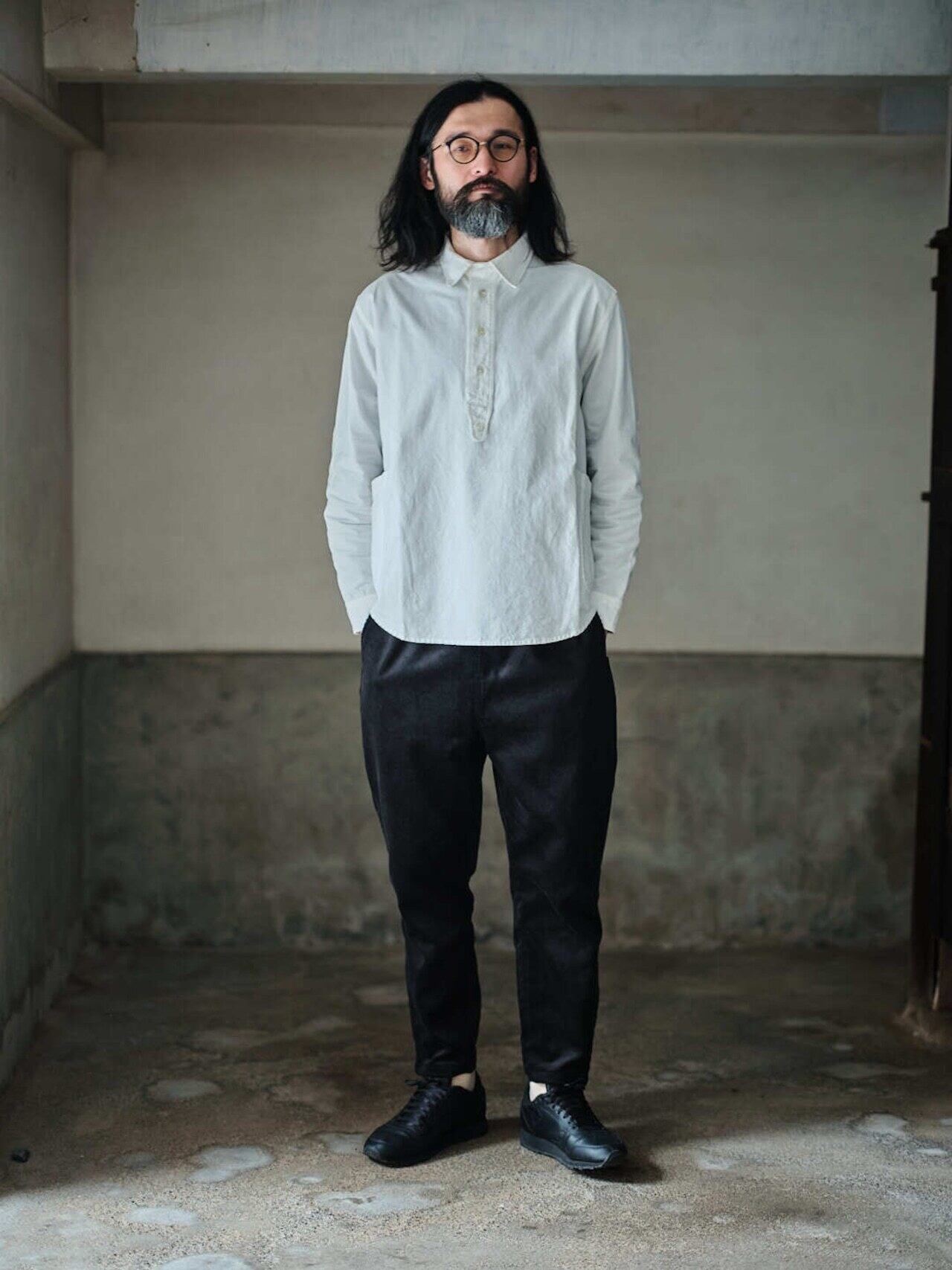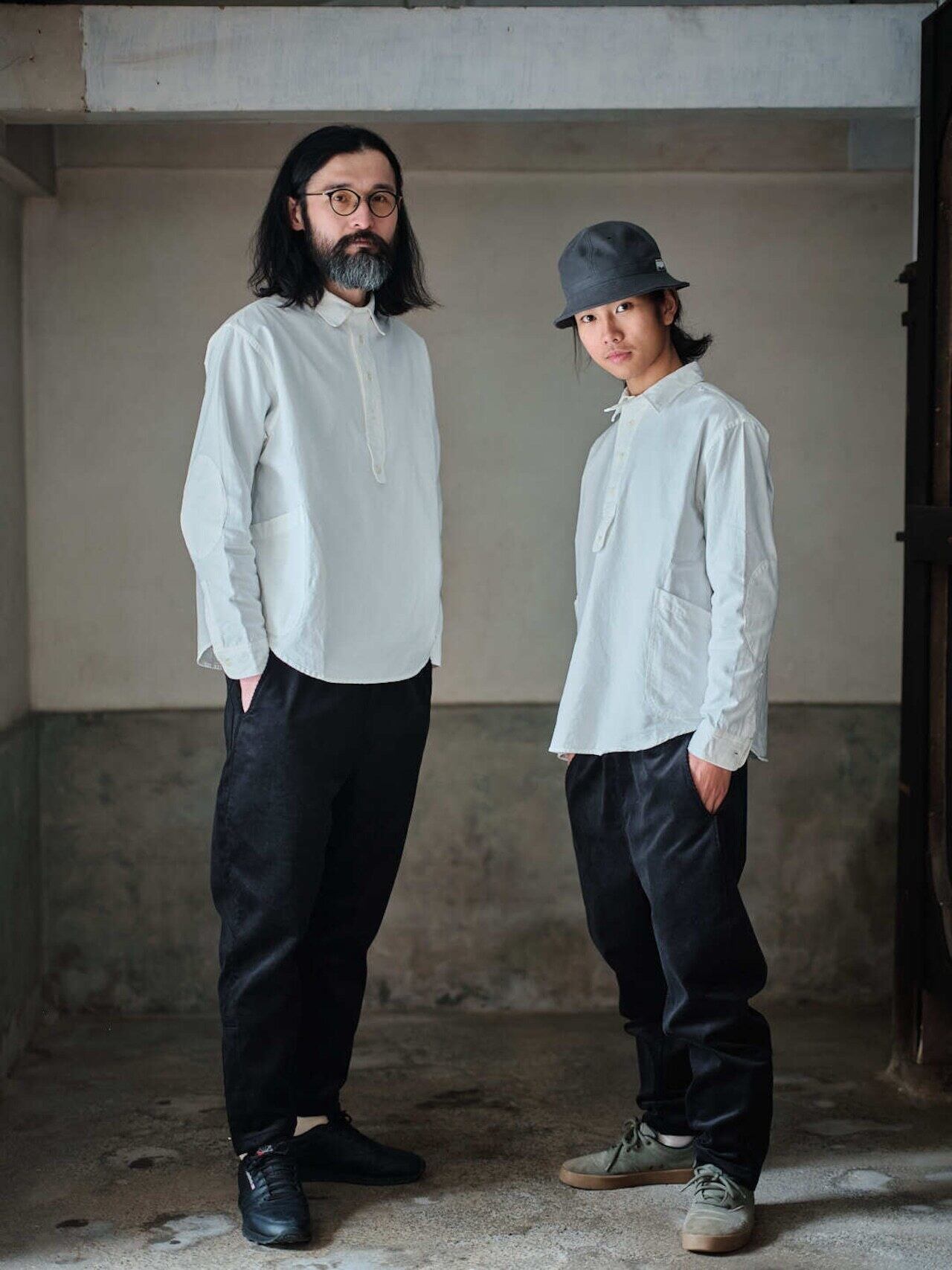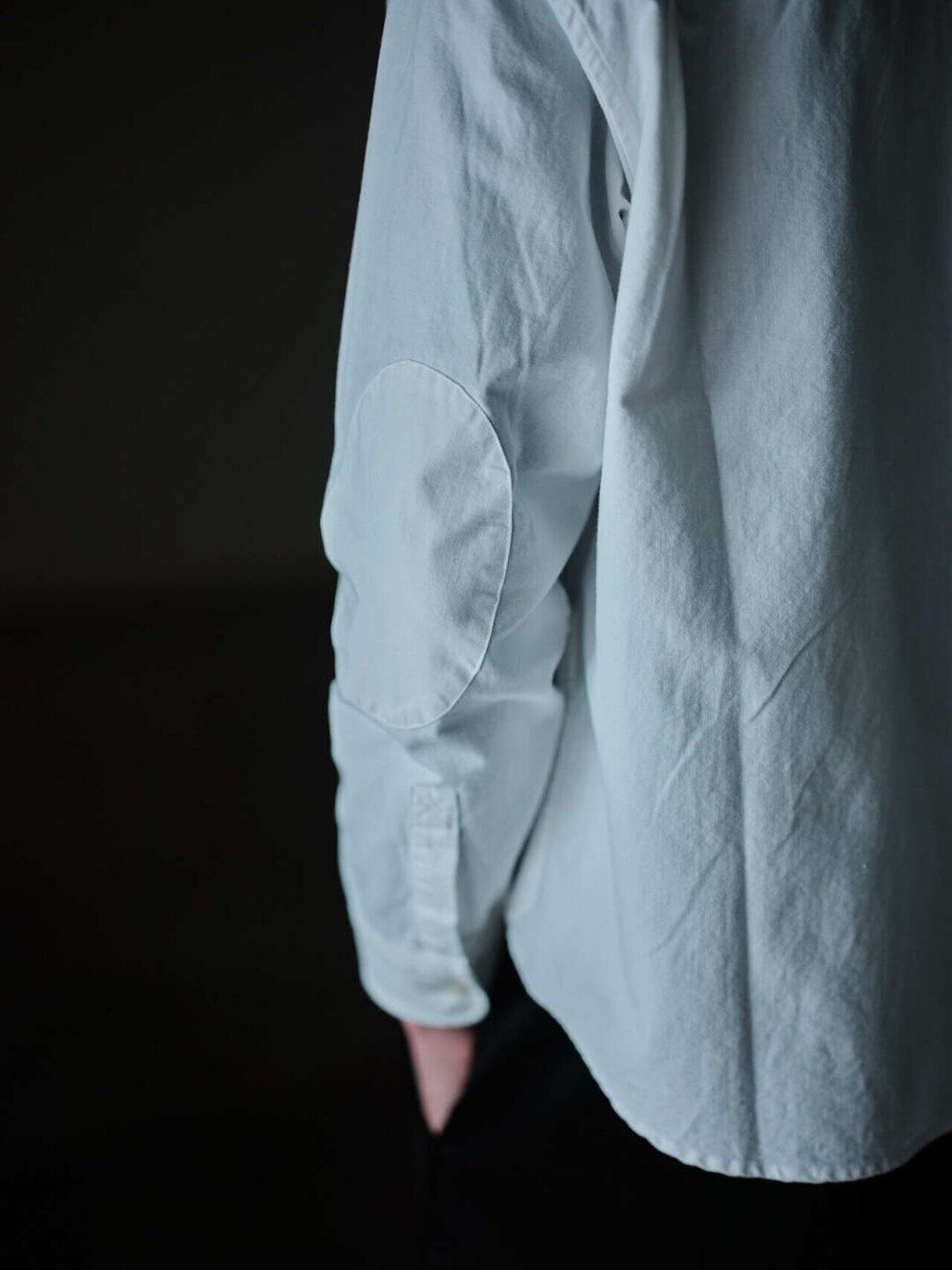 作業着の様な雰囲気を持つ白シャツをテーマに、身幅はややゆったり目に、丈は短く作られ、同色で付けられたエルボーパッチやポケットのディティールなど、随所にワーク感漂うデザインとなってます。