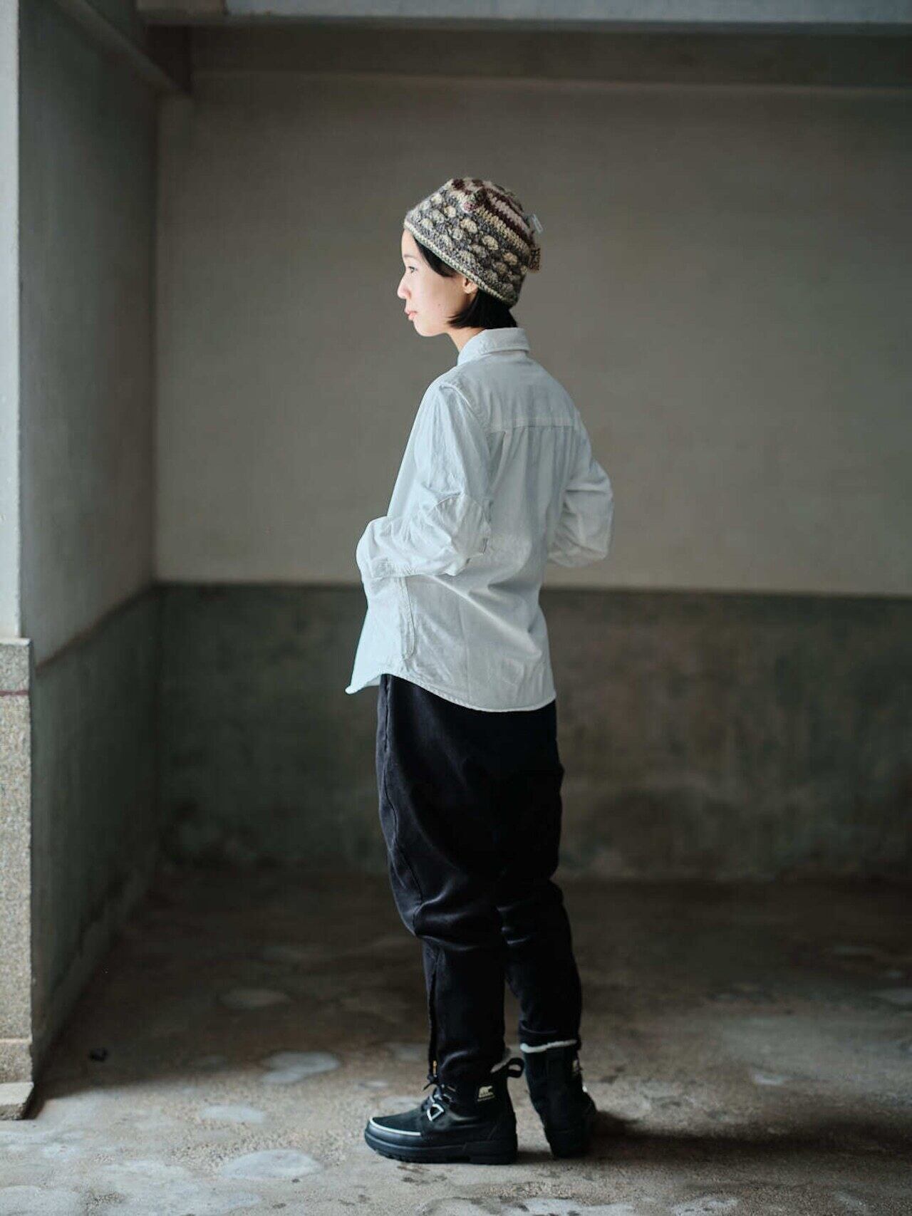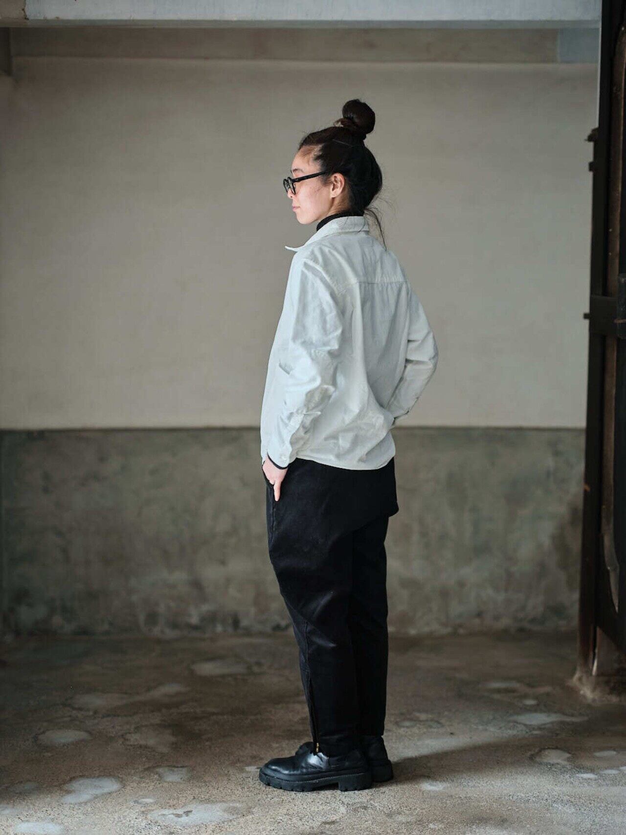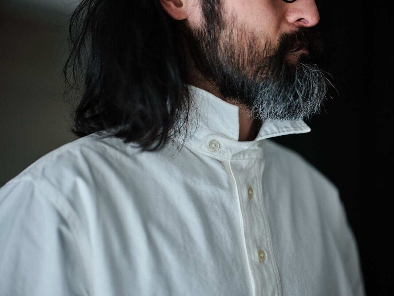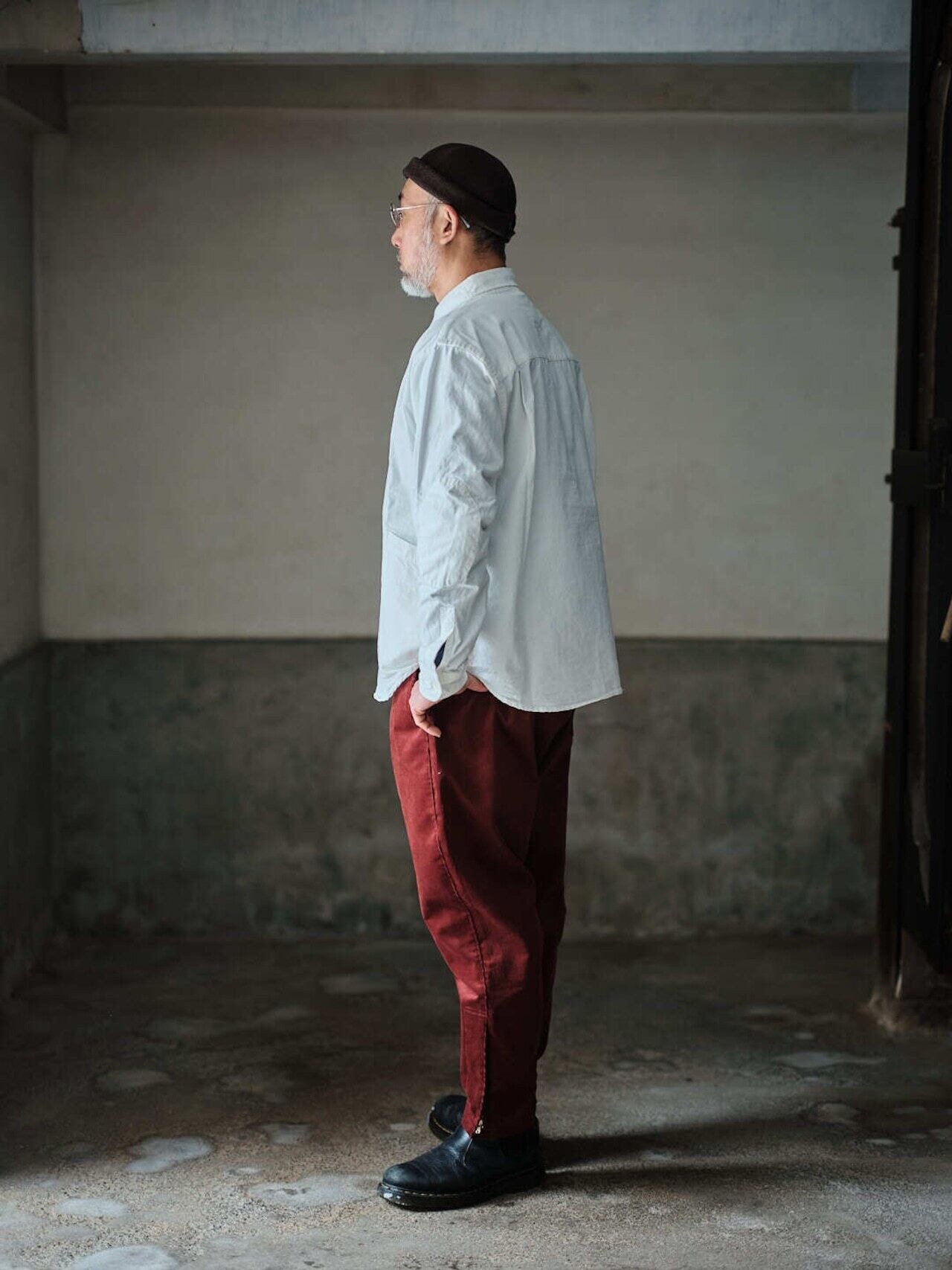 作業着の様な雰囲気を持つ白シャツをテーマに、身幅はややゆったり目に、丈は短く作られ、同色で付けられたエルボーパッチやポケットのディティールなど、随所にワーク感漂うデザインとなってます。