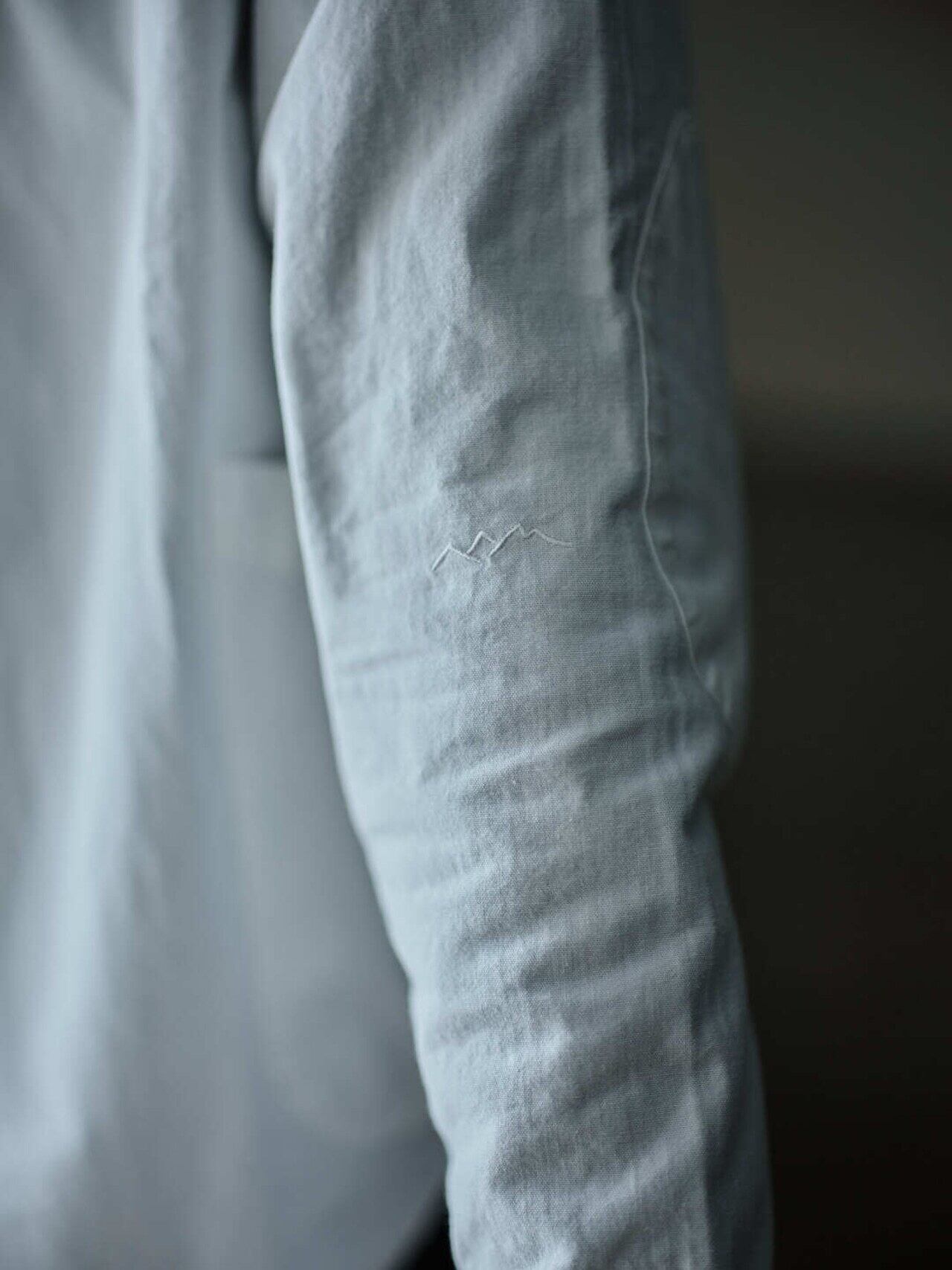 左肘内側くらいの位置に同色で飛騨の乗鞍山脈をイメージした刺繍や、首元内側にはmokusiroと乘鞍印のタグがつけられています。