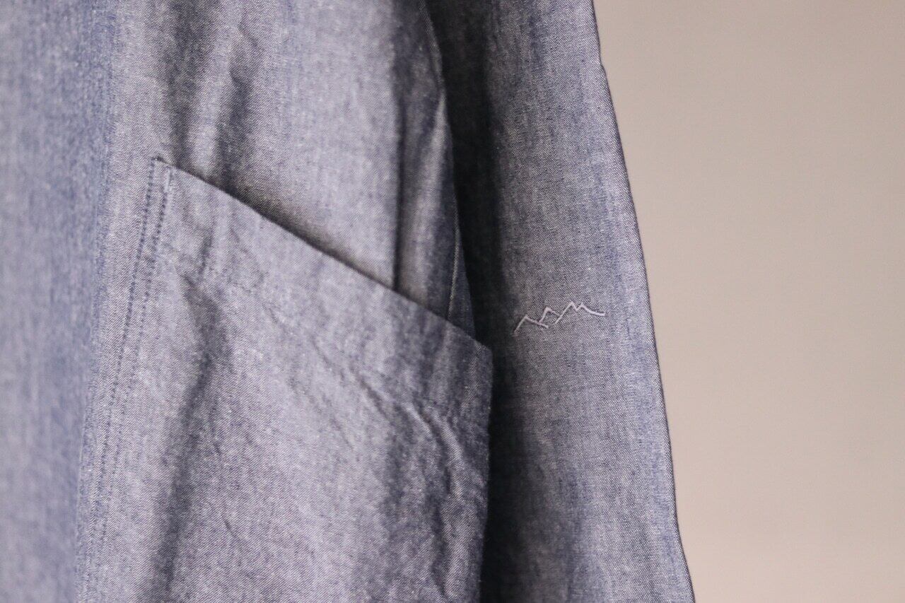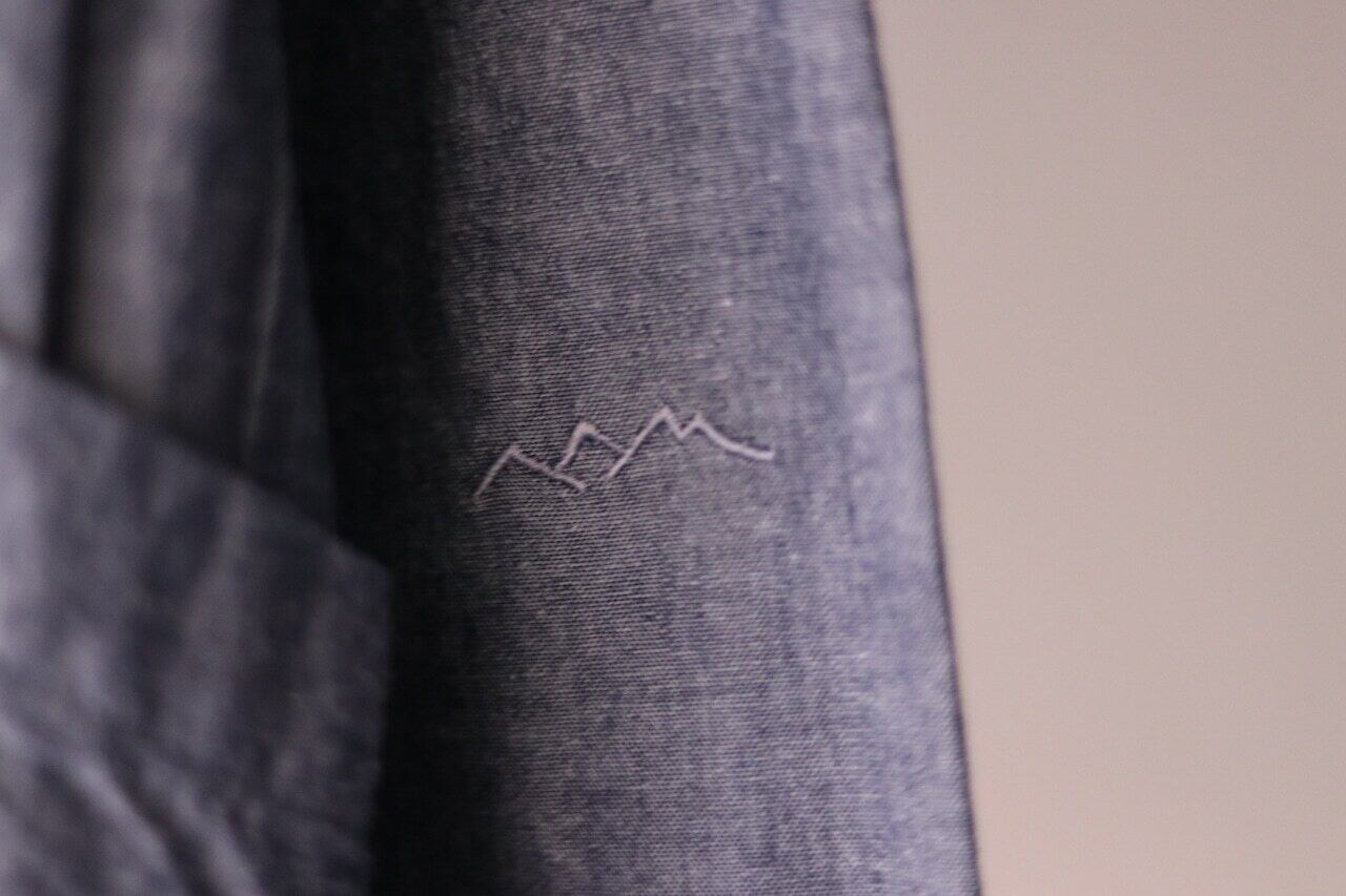 左肘内側くらいの位置に同色で飛騨の乗鞍山脈をイメージした刺繍や、首元内側にはmokusiroと乘鞍印のタグがつけられています。