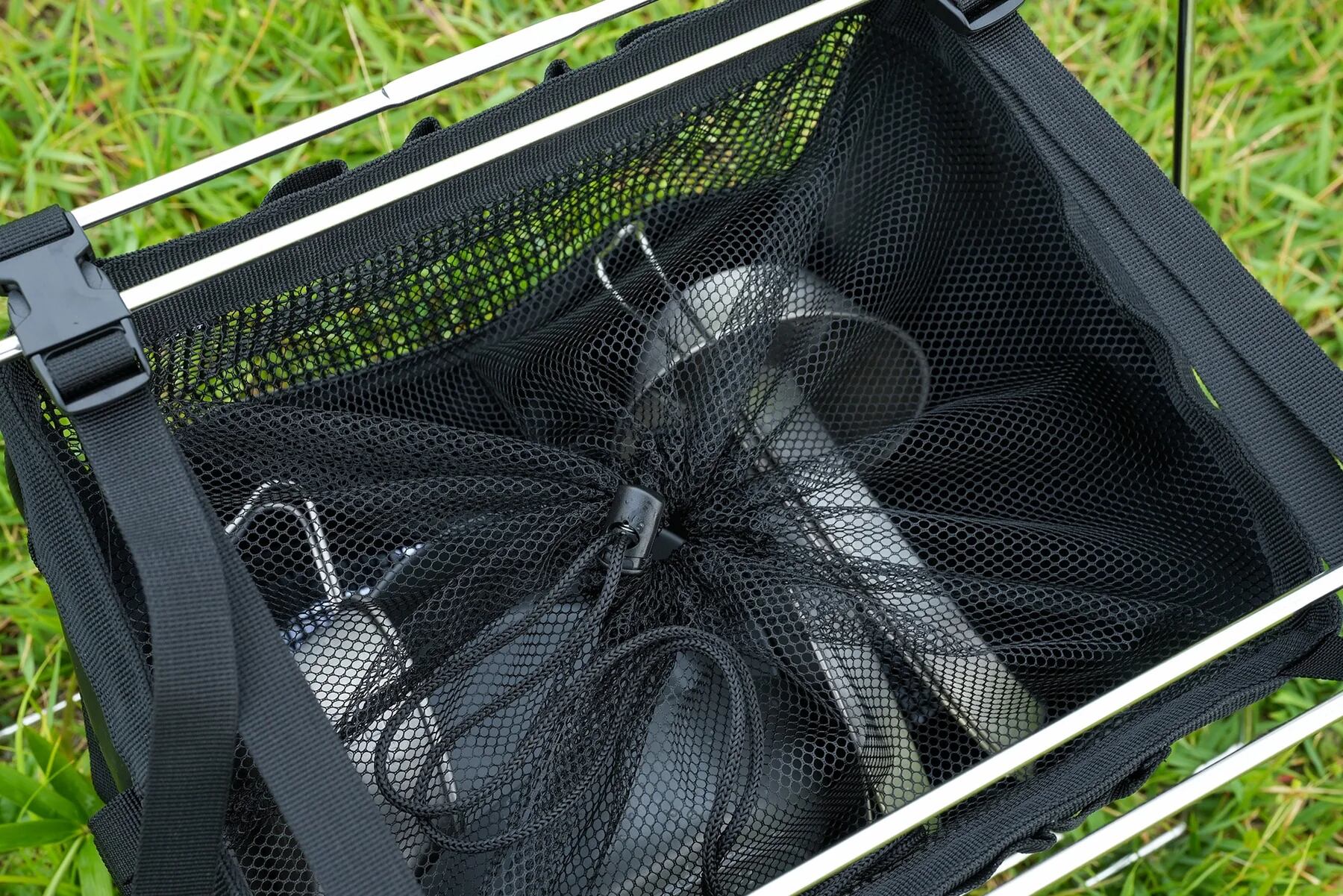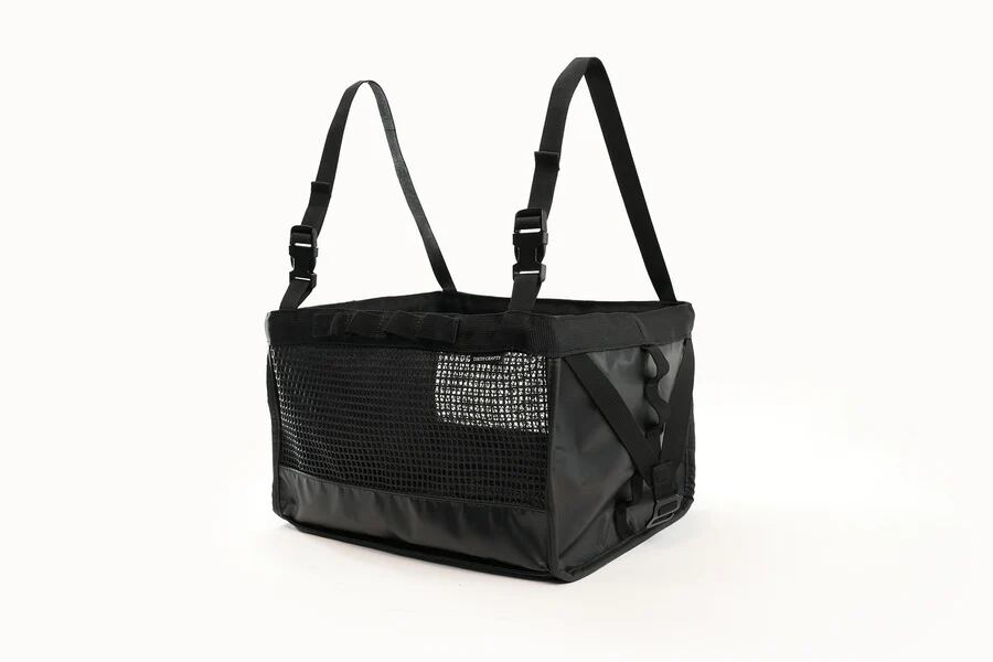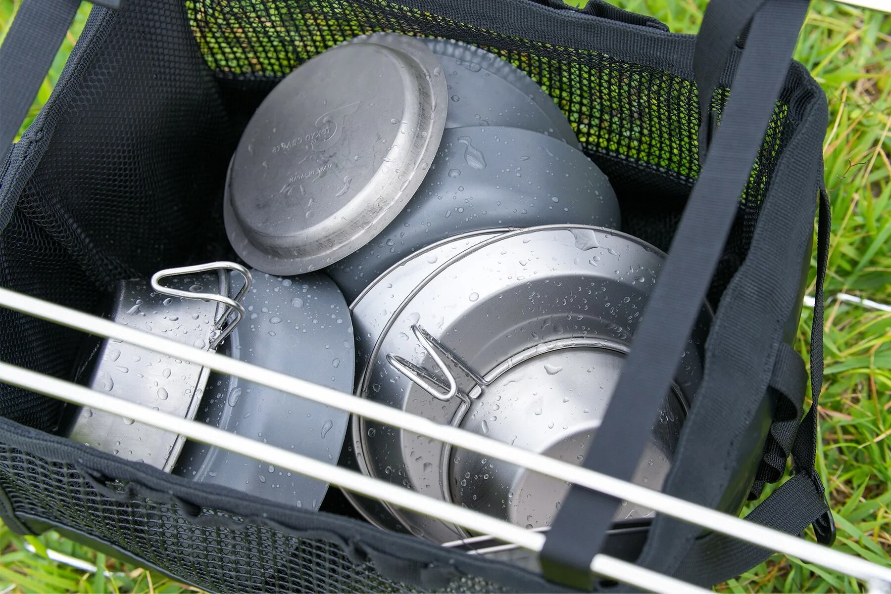 洗った食器やクッカーをそのまま入れて乾かせるメッシュ構造。通気性が高く、湿気による錆び・カビの発生を抑制します。中身がひと目で分かるので整理もしやすく、ギアポーチとしても便利です。