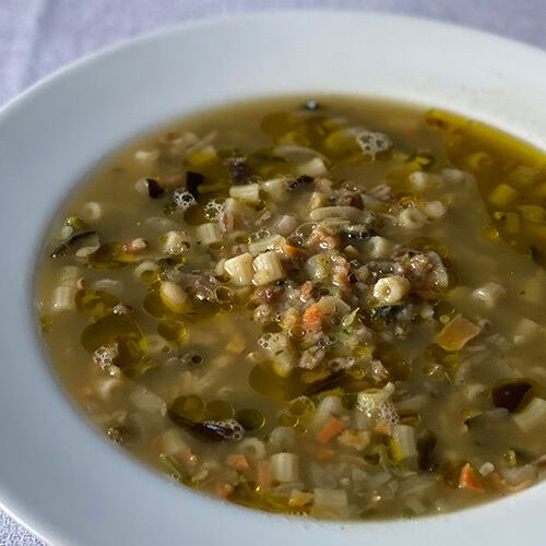 トスカーナなどイタリア中部で愛される、豆を使った伝統的な野菜スープ。野菜9種類、ファッロ(古代小麦)などをがたっぷりの具だくさん、食べるスープです。トマトソースを加えると旨味とコクがアップします。仕上げにオリーブオイルをたっぷりと。