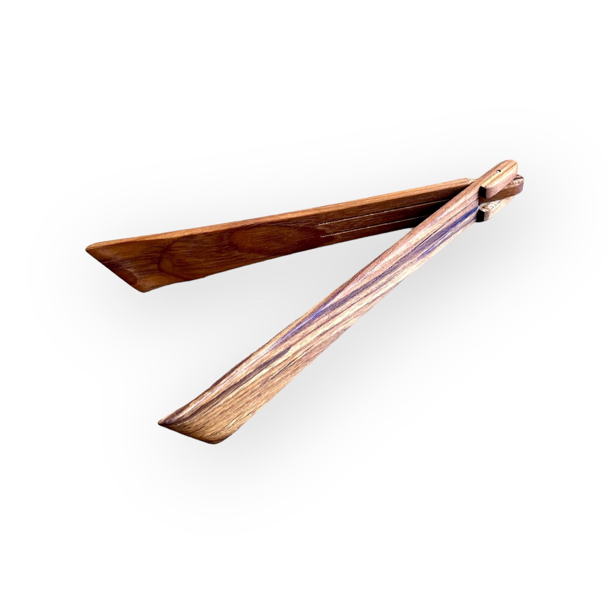 2枚のパーツを留めてある部分を軸にひっくり返すと、切り込み部分が木の弾力でバネとなるというアイデア商品です。